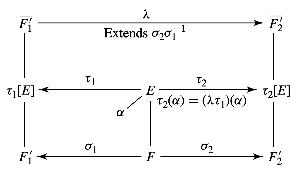 - $\sigma$를 확장하는 사상 $\tau: E \to \overline{F’}$가 존재한다.